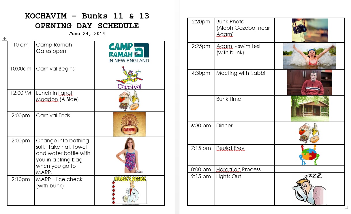 In the programs run at Camp Ramah, for example, an inclusion specialist will offer a visual schedule of the flow of the day with pictures, words, or both. These are especially helpful on special days where the schedule is different than normal.